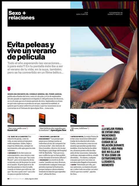 Este mes en la revista Men’s Health colaboramos en el artículo “Evita peleas y vive un verano de película” con algunos consejos para evitar las peleas de pareja en las vacaciones veraniegas. Y es que no es casualidad que septiembre sea el mes en el que más rupturas de pareja se producen, es el momento en el que más tiempo compartimos del año y por tanto donde pueden surgir más roces.