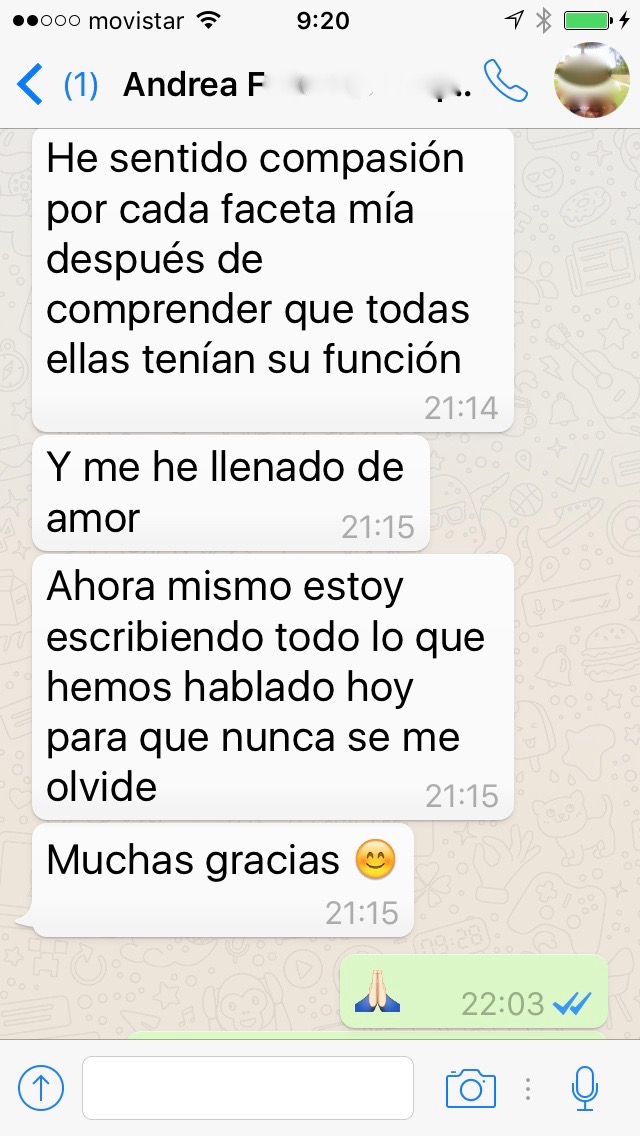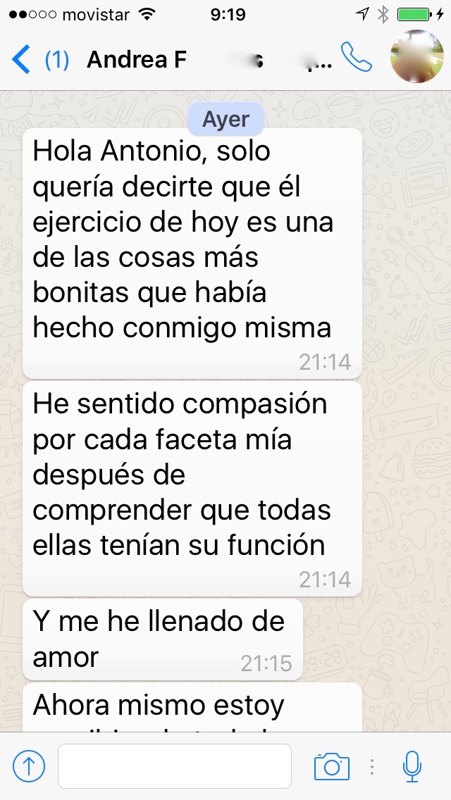 Es un curso abierto a cualquier persona que quiera mejorar la relación consigo misma y para aquellos profesionales que deseen aprender las bases de una técnica muy útil en consulta. Comparto con vosotros las palabras de una persona que estuvo realizando ayer la técnica en la consulta porque expresan de una manera mucho más hermosa y profunda de lo que yo puedo escribir aquí el proceso que se consigue con Big Mind